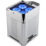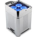 A completely wireless IP65 rated battery powered up-light with four high powered quad colored RGBA LEDs that is controlled by W-DMX or IR remote.