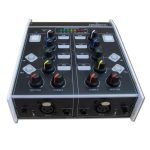 The Express ip Mini is a compact and rugged two-person commentary box that features a Dante/AES67 network audio interface. It has four external monitor inputs and a sidetone monitor circuit for each commentator. It also has two common talkback circuits with configurable talkback buttons and mic inputs with selectable 48v phantom power. Each mic input also has a compressor/limiter circuit to prevent audio overload.