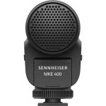 The MKE 400 is a highly directional, super-cardioid shotgun microphone designed for capturing isolated and enhanced in-camera audio. It features integrated wind protection and internal suspension mount to minimize handling noise, as well as a built-in low-cut filter and 3-step sensitivity switch for added flexibility and control. Additionally, it has an integrated headphone output jack with volume adjustment for audio monitoring and interchangeable 3.5 mm TRS and TRRS connectivity for DSLR/M cameras or mobile devices. The MKE 400 is also available as the MKE 400 Mobile Kit, which includes the microphone, Sennheiser Smartphone Clamp, and Manfrotto PIXI Mini Tripod.