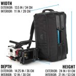 The Cineluxe v2 Backpack 24 fits professional camcorders, cinema cameras and ENG rigs from ARRI, Sony, Canon, RED, Blackmagic and others. The interior height (12 in/30 cm) and length (21 in/53 cm) enables camera rigs to be stored with baseplate, matte box, monitor, mic and battery attached, ready to shoot. This is the first ever video camera backpack developed with a quick access “doctor bag” style opening.