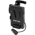 The system also includes 3 D-Tap ports for accessory power and a digital fuse that cuts off accessory outputs while keeping the camera powered. The battery plate position can be easily adjusted by loosening the thumbscrew and sliding it into place. Additionally, the camera has a DC Input on the right side that allows for hot-swapping between block batteries and on-board batteries.